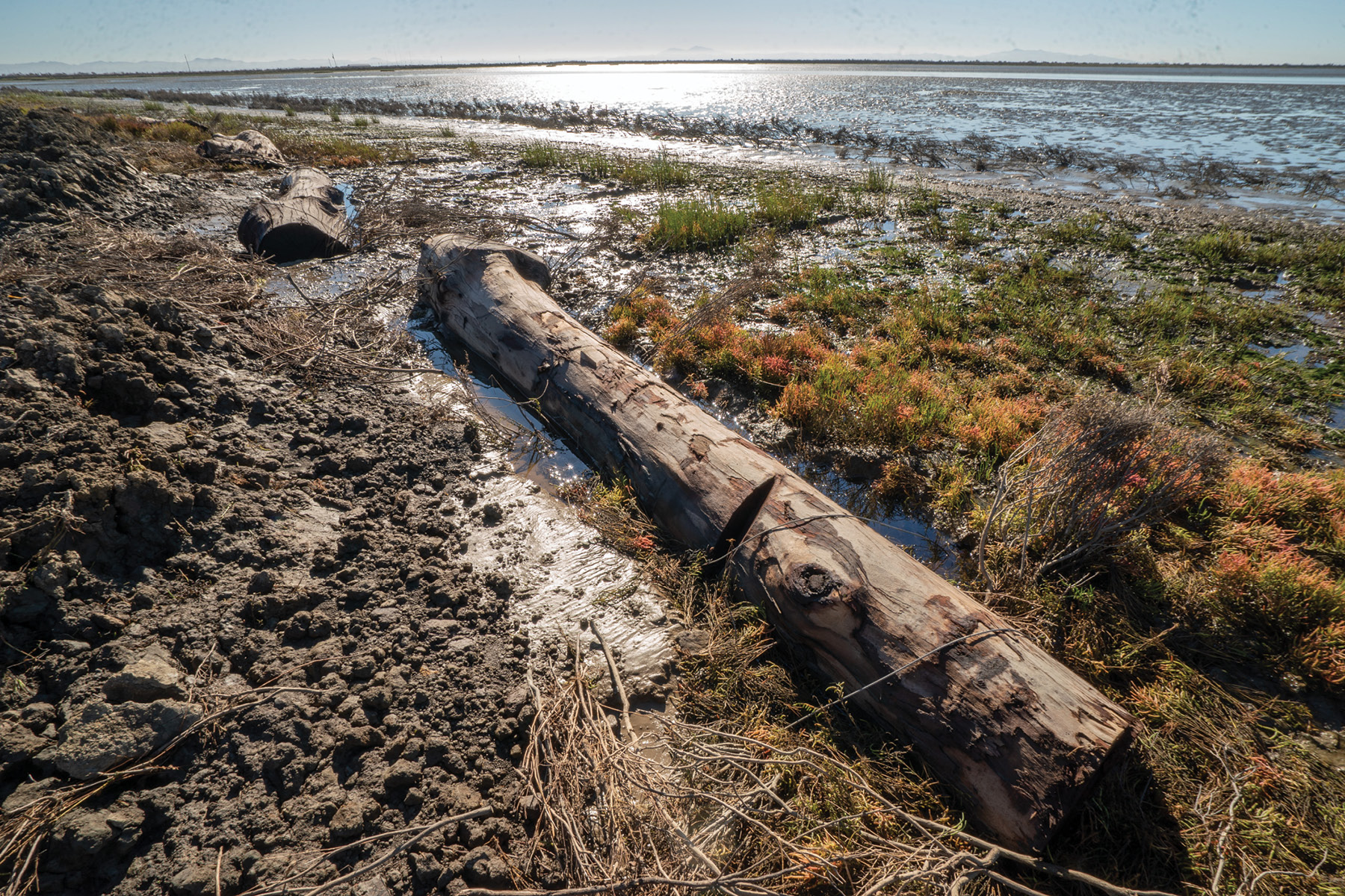 A large log rests on the ground in a tidal marshland amid a sunny day.