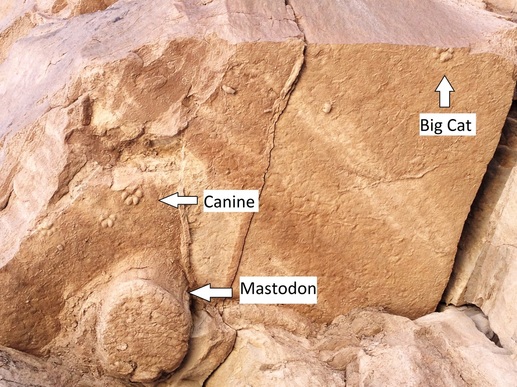 Thousands of sea shells were cemented into the sedimentary rock at our feet, remnants of the ancient inland sea that once existed here. Further up the wall, a curious sight protruded from younger rock strata. Familiar-looking animal tracks were imprinted on a ceiling of overhanging rock.