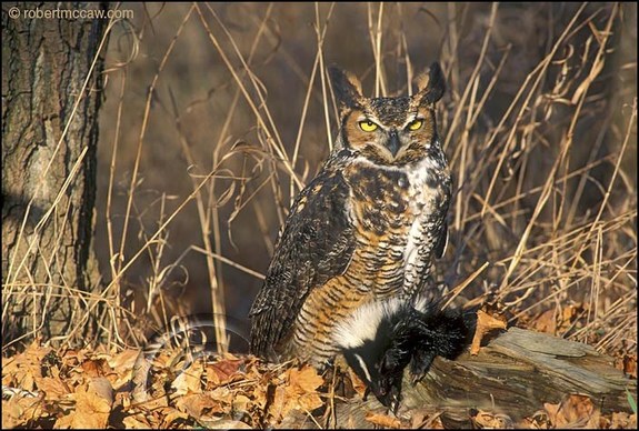 Despite the fact that the average Striped Skunk weighs 6−8 pounds and has a potent system of self-defense, Great Horned Owls, weighing in at about three pounds, consume skunks with regularity. The longstanding assumption that birds lack a sense of smell is turning out to be myth as current studies reveal that birds have a high number of active olfactory genes. So although Great Horned Owls probably do experience scent, they may find skunk musk more akin to delicious stinky cheese than putrid flowers left to sit in the vase too long. In any case, a skunk’s most notorious and effective defense mechanism is powerless against predators striking from the sky.