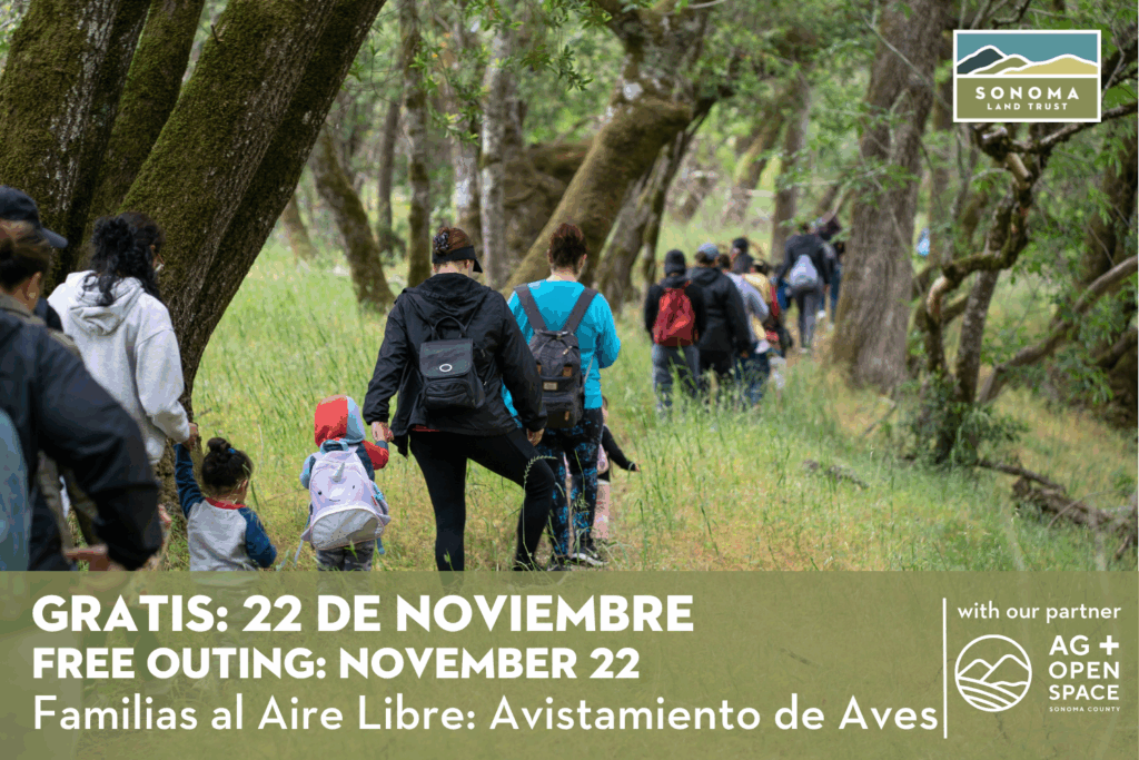 Únase a Sonoma Land Trust y Espacios Abiertos y Agrícolas en sus excursiones familiares bilingües mensuales, en las que visitamos diferentes parques y preservas cada mes. Estas excursiones gratuitas se dirigen en español y están diseñadas con actividades para toda la familia: padres, abuelos, hijos y nietos. ¡Hay transporte disponible!