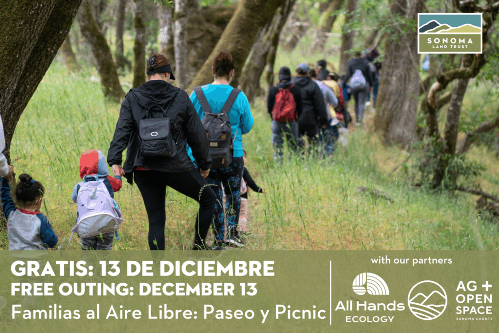 Únase a Sonoma Land Trust, Ag+ Open Space y All Hands Ecology el 13 de diciembre para una caminata a través de dos reservas. Comenzaremos en la Reserva Bouverie y caminaremos por Glen Oaks Ranch para terminar con un potluck picnic de invierno. Esta salida es gratuita, se llevará a cabo en español y está diseñada con una actividad artística para toda la familia — padres, abuelos, hijos y nietos. ¡Hay transporte disponible!