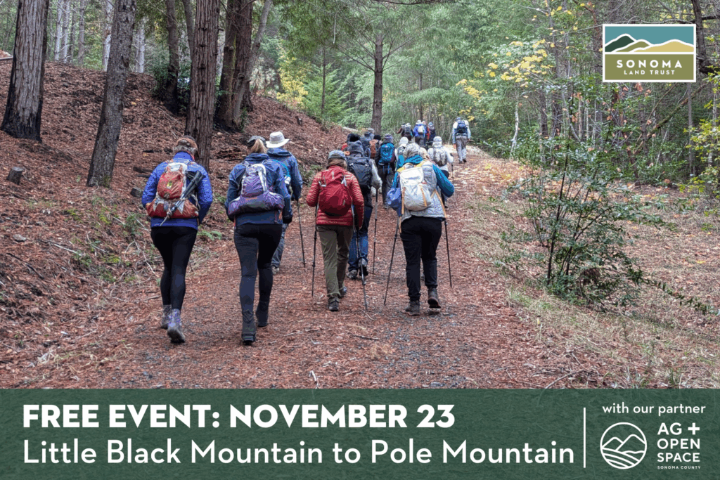 Join Sonoma Land Trust and Ag + Open Space for a guided hike up the north side of Pole Mountain. We’ll learn about the history of fire and forest management as we hike through the forest of the Little Black Mountain Preserve to reach the 2,204-foot summit for amazing 360-degree views of the Sonoma Coast and beyond. This is a 6-mile round-trip hike with a 1,000-foot elevation gain.