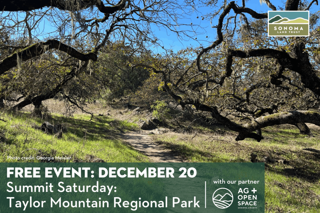 Join Summit Saturday Team Sugarloaf State Park Volunteers, Ag+ Open Space and Sonoma Land Trust for a double lollipop hike at Taylor Mountain Regional Park. The Summit Saturday Team is a group of Sugarloaf volunteers. When they ran out of summits at Sugarloaf, they started branching out to other parts of Sonoma County. Taylor Mountain protects phenomenal wildlife and natural resources while providing amazing recreational opportunities. It was originally protected by a coalition of community members and organizations when it was purchased by Sonoma County Regional Parks in 2011. Join us this December to visit the East Knoll vista point and walk the Panorama and Cooperage Ridge Trail Loop. In total, the hike will be 7.4 miles with 1,338 ft in elevation gain.