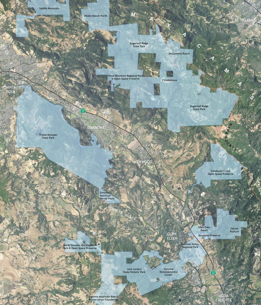 The lands of the Sonoma Valley Wildlands Collaborative comprise over 20,000 acres in 16 individual parks and preserves. Together these properties make up a significant portion of the wildlands that burned in the 2017 Nuns Fire and previous high-intensity wildfires in the region. Managed by our partners for ecological benefit, open space, outdoor education, and recreation, these properties share Sonoma Valley with the communities of Oakmont, Kenwood, Glen Ellen, Bennett Valley, Eldridge, El Verano, Fetters Hot Springs, Agua Caliente, and Sonoma.